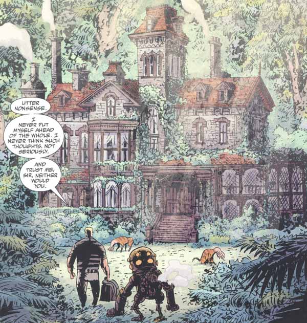 I love the whole crazy business with Caul’s former buddies in the Oannes Society, now living in robotic suits that resemble deep-sea diving equipment. I adore Guy Davis’ memorable illustration in issue #2 of the huge man talking to a guy in a robotic suit, walking up the path to an enormous beautiful mansion deep in the secluded jungle. How much do I love this crazy-weird series that it gave us this wonderfully unique image??? I just love this whole back-story of the Oannes society, as we learn more about Langdon Caul and his friends’ obsession with the sea and what they have been trying to accomplish all these years. (And we’ll learn more about the Oannes society in future stories…)